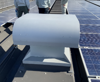 故障によりルーフファンが停止していましたが、屋内の精密機械にホコリが落下しないよう、厳重な養生が必要な現場でした。また、ファン自体に長年のホコリが堆積しており、慎重な作業が求められました。