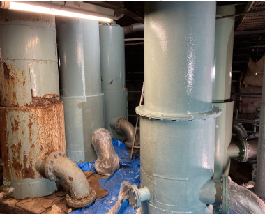 水分を含んだ空気により、タンク内部に錆と穴が発生。更新には高額なコストがかかる上、製造ラインを長期間停止できない状況でした。また屋内設置のため、大型機器の搬入経路もありませんでした。