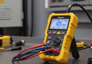 絶縁体が適切に機能しているかを調べる装置です。分電盤内でこの機器を使い、一つ一つの回路の絶縁抵抗値を確認します。